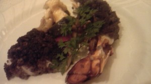 オマール海老と白身魚を黒オリーブとパン粉で焼いたもの